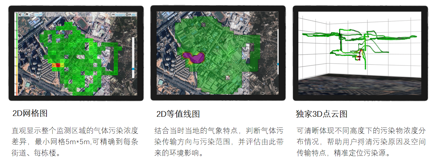靈嗅可通過與無人機、汽車等移動載具集成,實現對更廣闊區域的地面與空中監測,實時動態獲取多項空氣污染物的三維濃度分布情況,讓污染分布一目了然,從而快速鎖定氣體污染源的類型、位置與傳輸方向,為環保部門大氣防治提供行動思路和依據,高效、省時、節省人力成本。