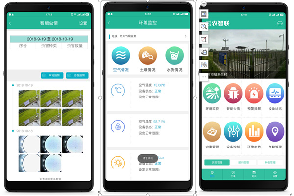 軟件部分,軟件分成云端web版和手機app版。軟件語言采用java與.net技術結合。系統構架采用云服務構架。包括:1、蟲害情況自動采集軟件和APP;2、農業環境氣象數據監測系統及APP;3、農業生態環境在線監測存儲系統軟件;4、孢子智能拍照統計監管系統;5、蟲害性誘監測系統;6、土壤肥力實時在線監測系統。